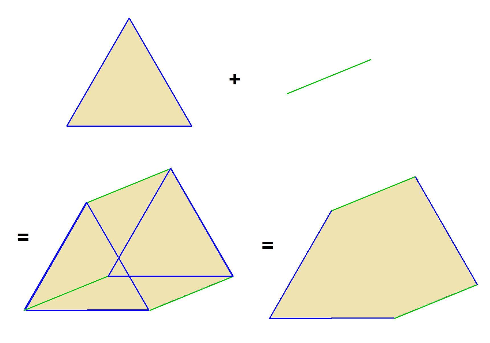 Like a simple example, the sum of this triangle and segment is a 3D prism if nonplanar, or a pentagon if coplanar. The pentagon has 5 edges, 2 edges of the triangle, and 2 edges as two sides of the segment (or digon).