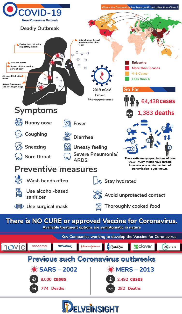 Despite strict travel guidelines, and restricted movement to and from- China, the caseloads of Wuhan Coronavirus are increasing at an alarming rate, with suspected cases now been confirmed, and a cloud of uncertainty on the number of deaths it may cause, looming. With the infected cases totalling to 45,168, and the deaths around 1,115- surpassing the death rate reported at the time of Severe acute respiratory syndrome (#SARS)- the novel Coronavirus has now come to know as Coronavirus disease 2019 (COVID-19). Therapies, which Pharma companies are reportedly working on, and have the potential to cure the coronavirus epidemic are: Noravax MERS, Invio’s INO-4700, Biocryst’s Galidesivir, AbbVie’s Lopinavir HIV inhibitor, Regeneron’s REGN3048-3051. To read more about coronavirus, visit: https://www.delveinsight.com/blog/coronavirus/ or https://www.delveinsight.com/blog/coronavirus-2019-ncov-is-now-covid-19/