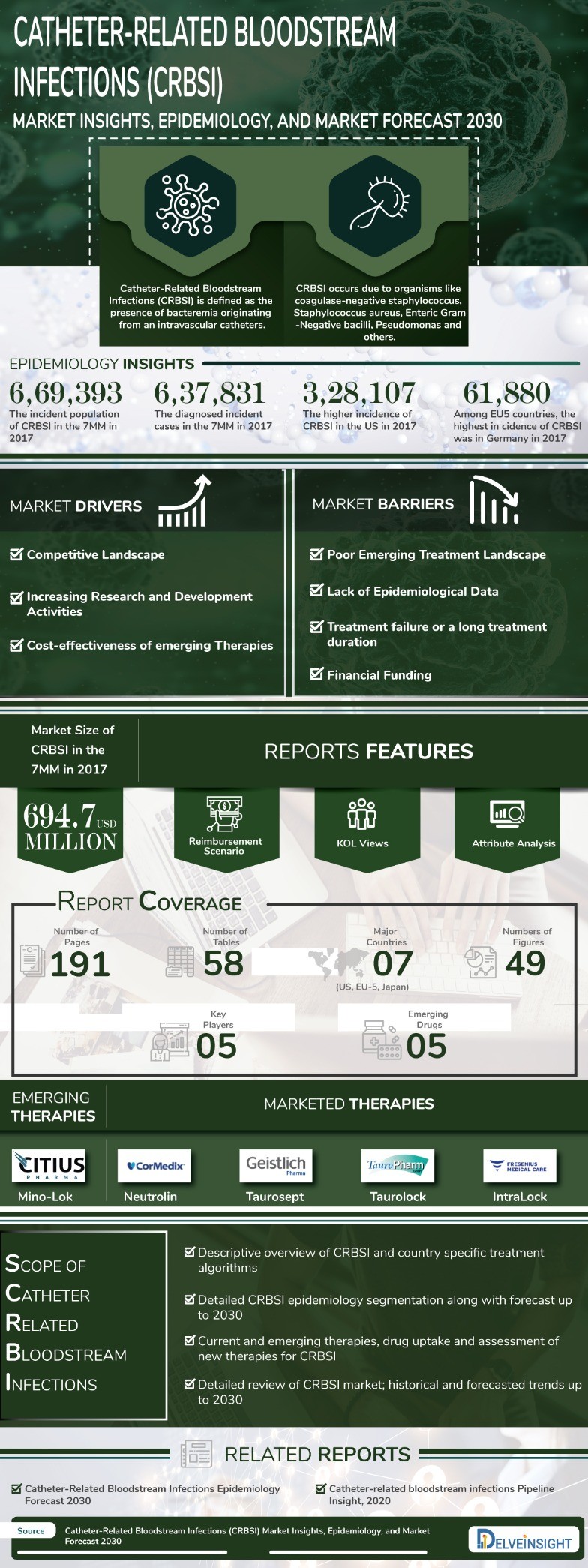 The market size of Catheter-Related Bloodstream Infection in the 7MM was USD 694.7 Million in 2017.
