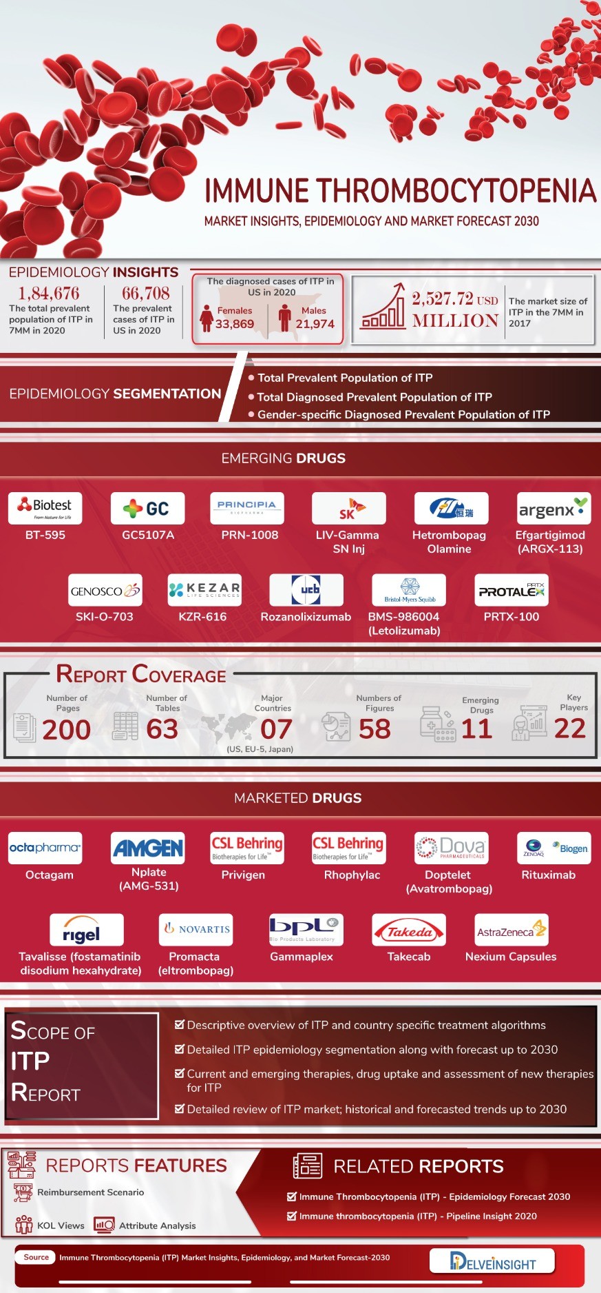The Immune Thrombocytopenia market size in the 7MM was approximately USD 2,527.72 million in 2017. The United States accounts for the largest ITP market size.