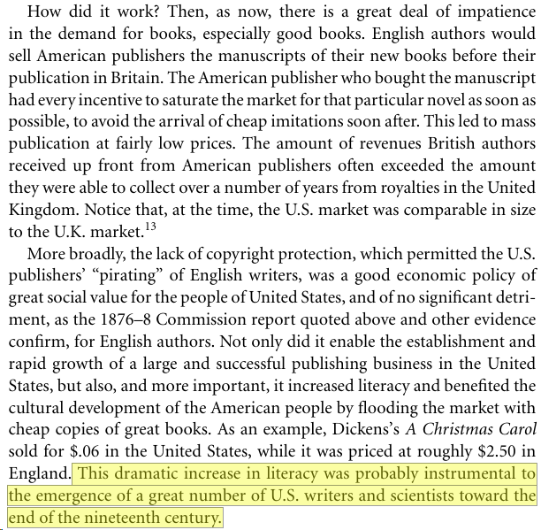Sin propiedad intelectual había mayor difusión y accesibilidad a la lectura lo que contribuyó a la alfabetización de USA, posterior a la implementación de la propiedad intelectual no hubo un aumento significativo en la publicación de obras literarias.