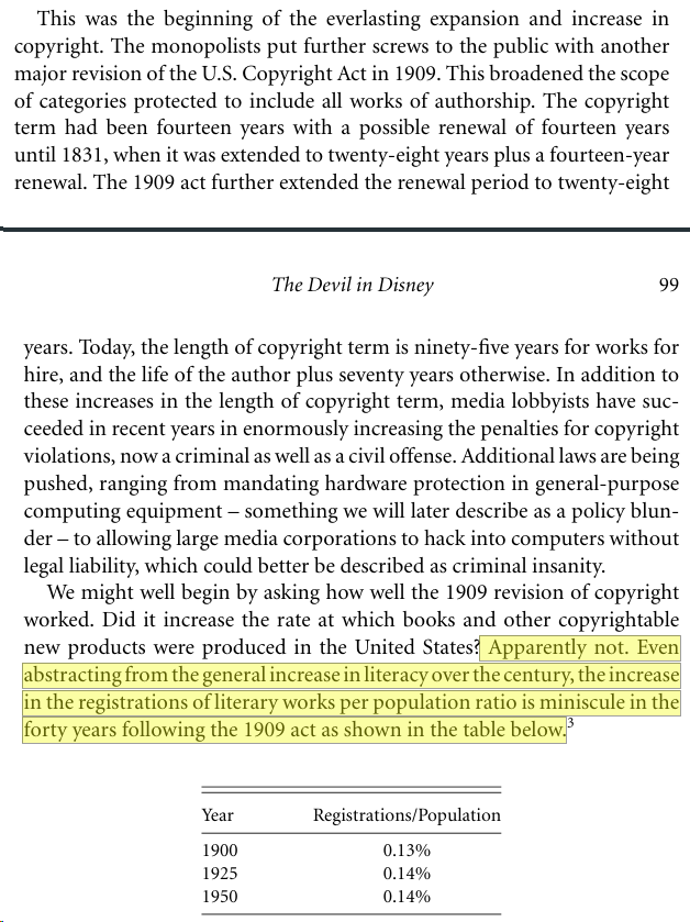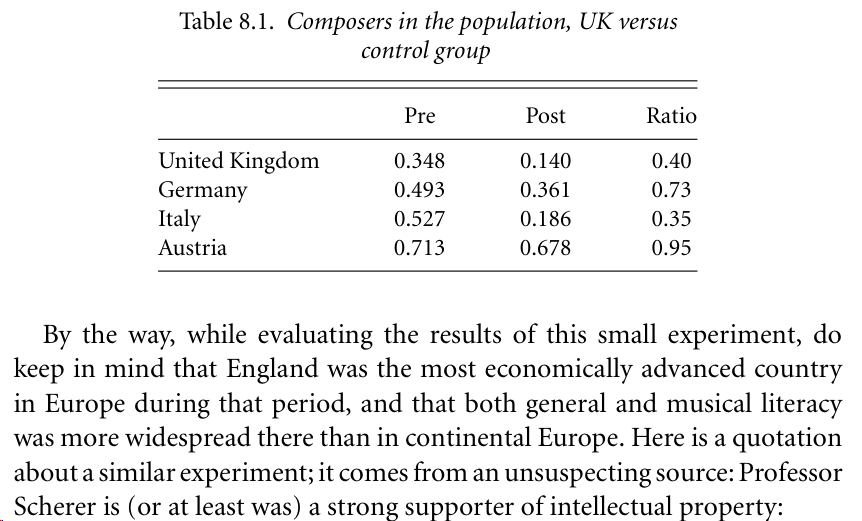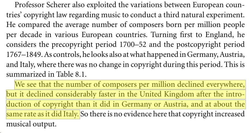 P. 188-9: La introducción de la propiedad intelectual en la música redujo la cantidad de compositores musicales en todos los países europeos que se introdujo -excepto Francia.