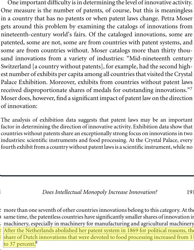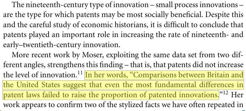 P. 190-1: gran parte de las innovaciones provenientes de ferias mundiales de tecnología del siglo XIX no estaban patentadas, los países que introdujeron leyes de patentes no aumentaron la proporción de innovaciones patentadas.
