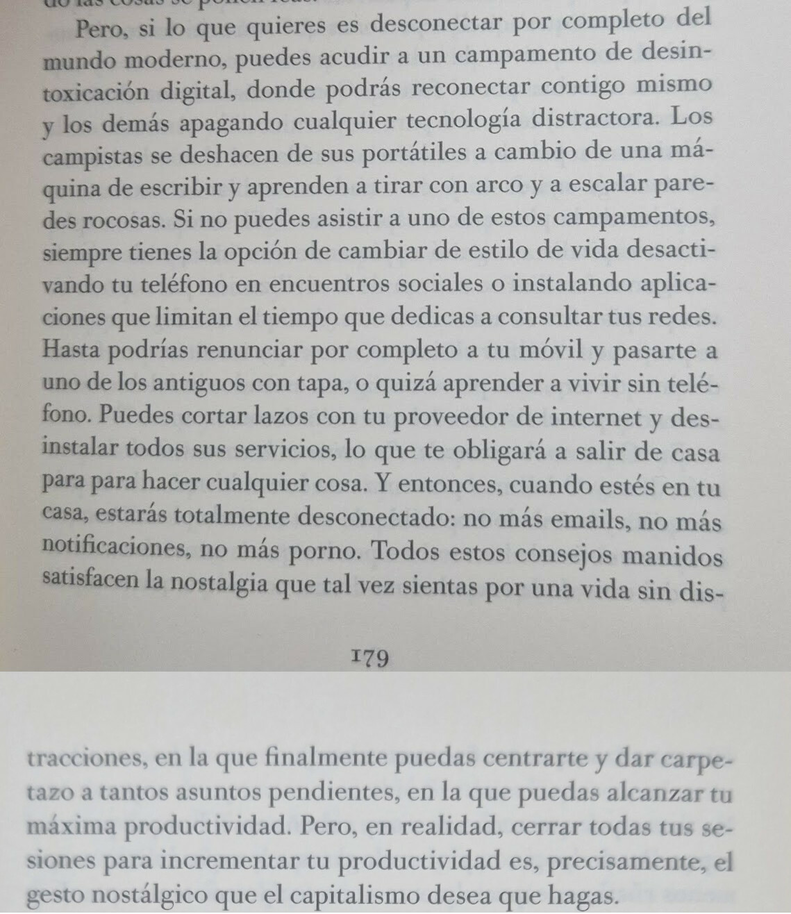 @avelinohm Una página de un libro con texto impreso en español. El contenido principal describe la desintoxicación digital y la desconexión del mundo moderno, ofreciendo diversas estrategias como asistir a campamentos sin tecnología o renunciar al teléfono móvil. El texto explora la nostalgia por una vida sin distracciones y concluye con una crítica sobre cómo la búsqueda de productividad a través de esta desconexión podría ser un deseo impulsado por el capitalismo. El número de página "179" se encuentra centrado en la parte inferior.