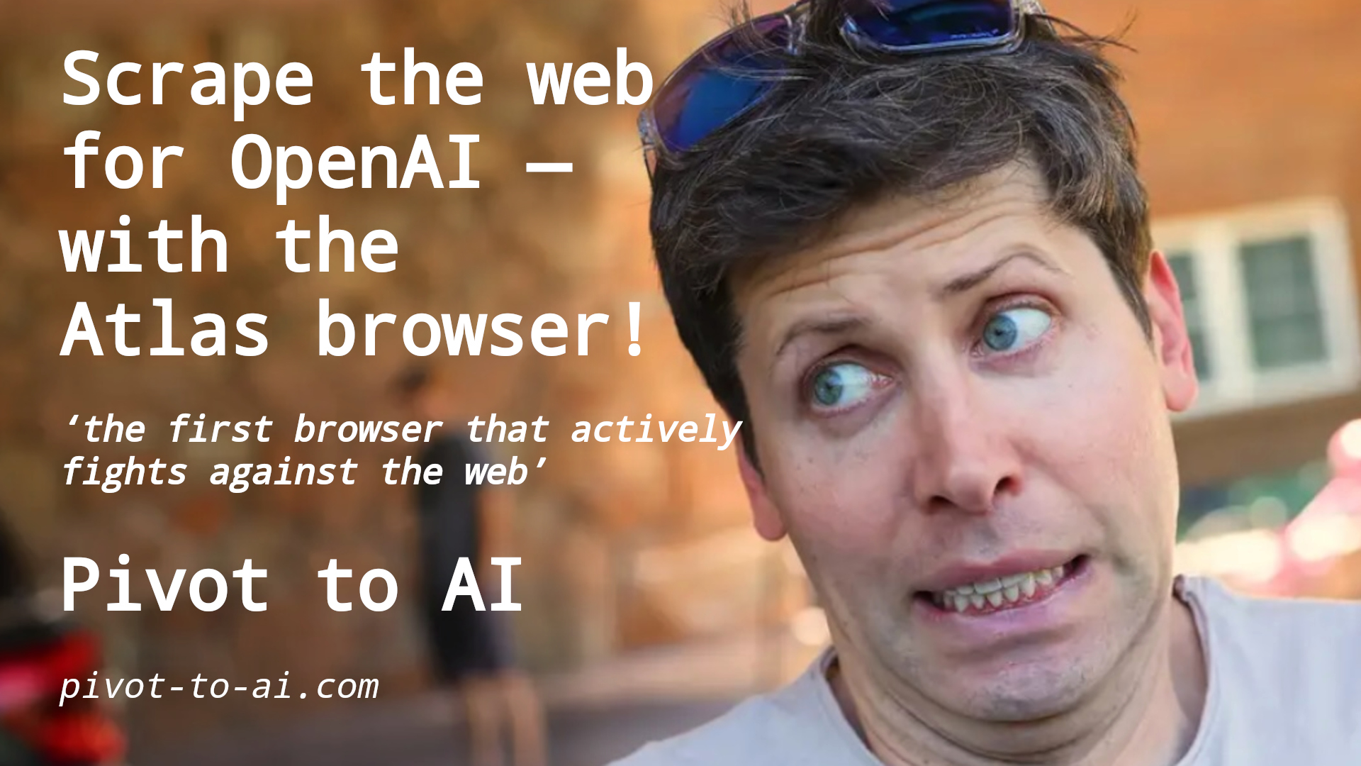 Scrape the web for OpenAI — with the Atlas browser! ‘the first browser that actively fights against the web’ www.youtube.com/watch?v=8jh4... - video pivottoai.libsyn.com/20251024-scr... - podcast time: 4 min 18 sec pivot-to-ai.com/2025/10/24/s... - text
