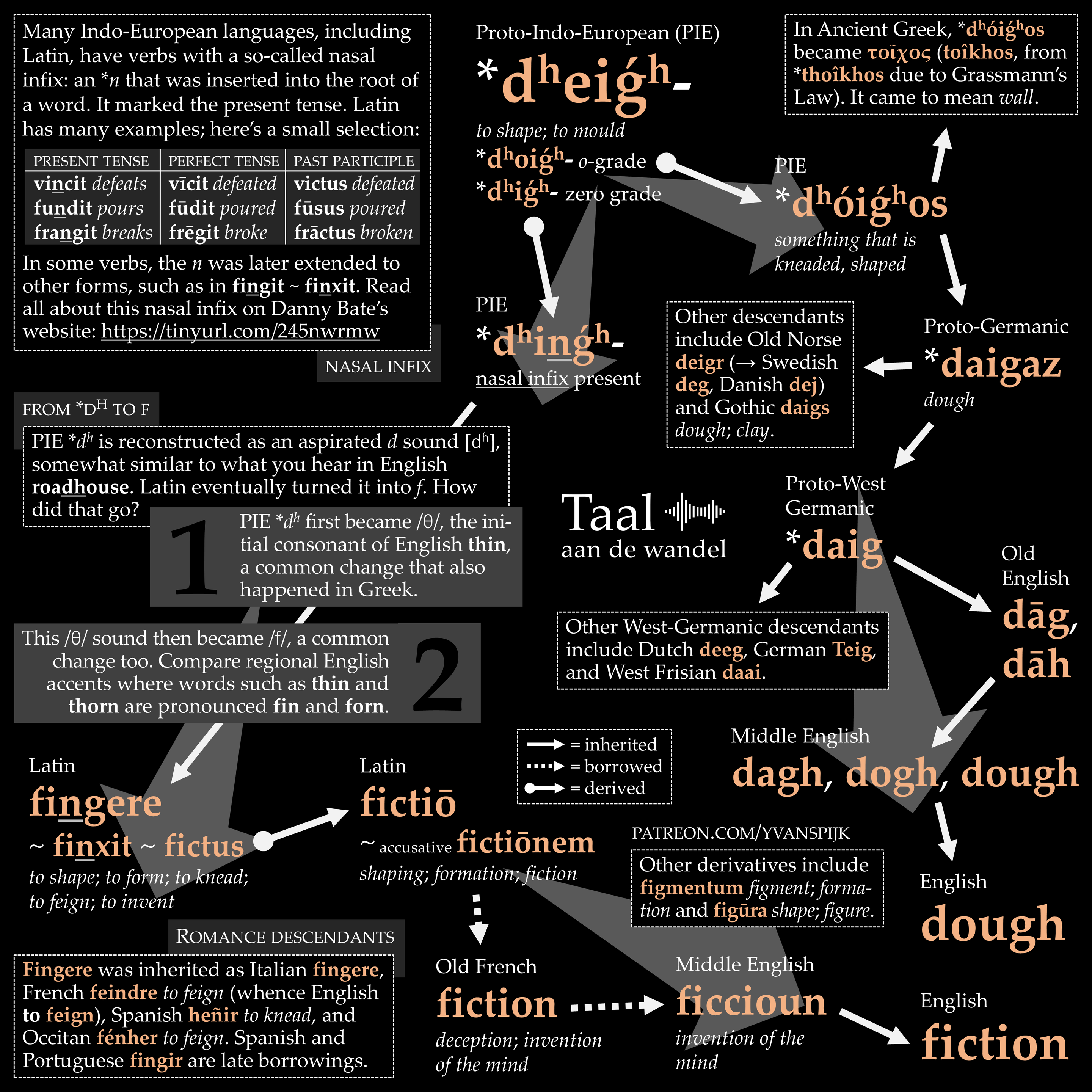The words 'fiction' and 'dough' derive from the same root.