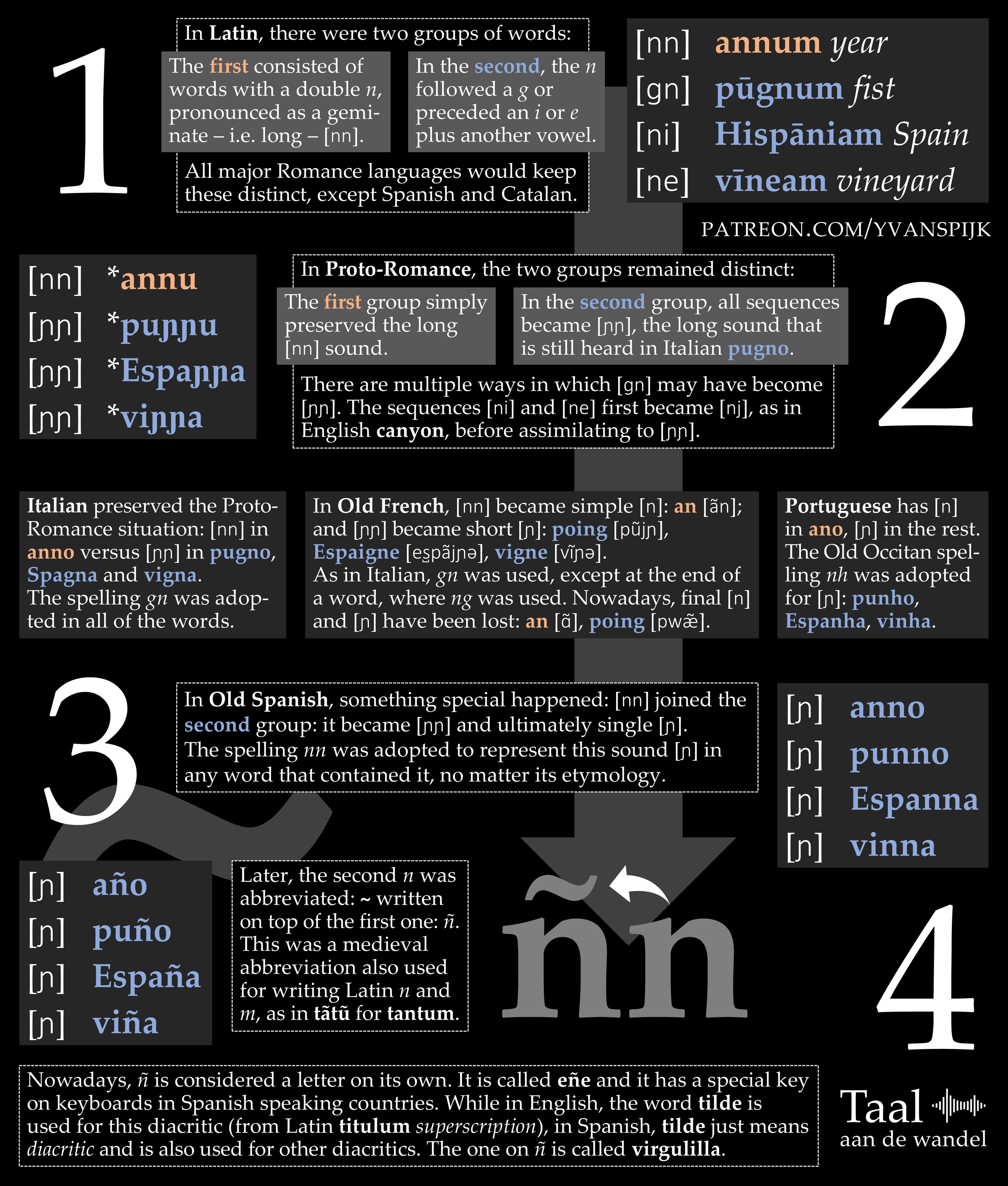 However, 'puño', 'España' and 'viña' come from 'pūgnum', 'Hispāniam' and 'vīneam', which didn't have nn.