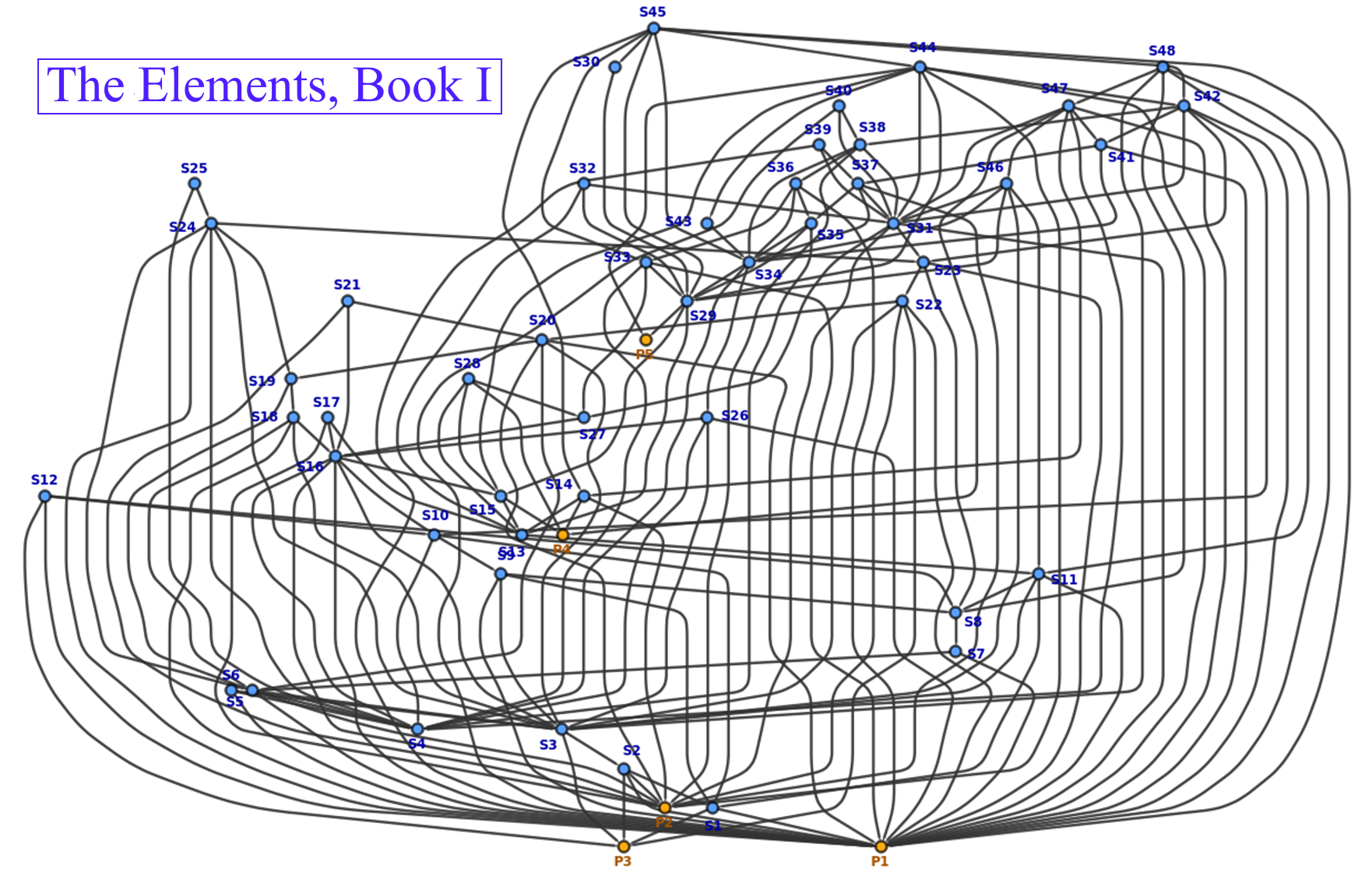 A graph of Euclid's Elements, book I. The propositions in blue. The Postulates in yellow. An edge means that a statement has been used in the proof of the proposition above. This was one of the slides in my public lecture for the "Tag der Mathematik" at Heidelberg University.