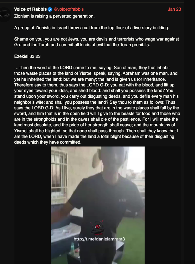 > A group of Zionists in Israel threw a cat from the top floor of a five-story building.