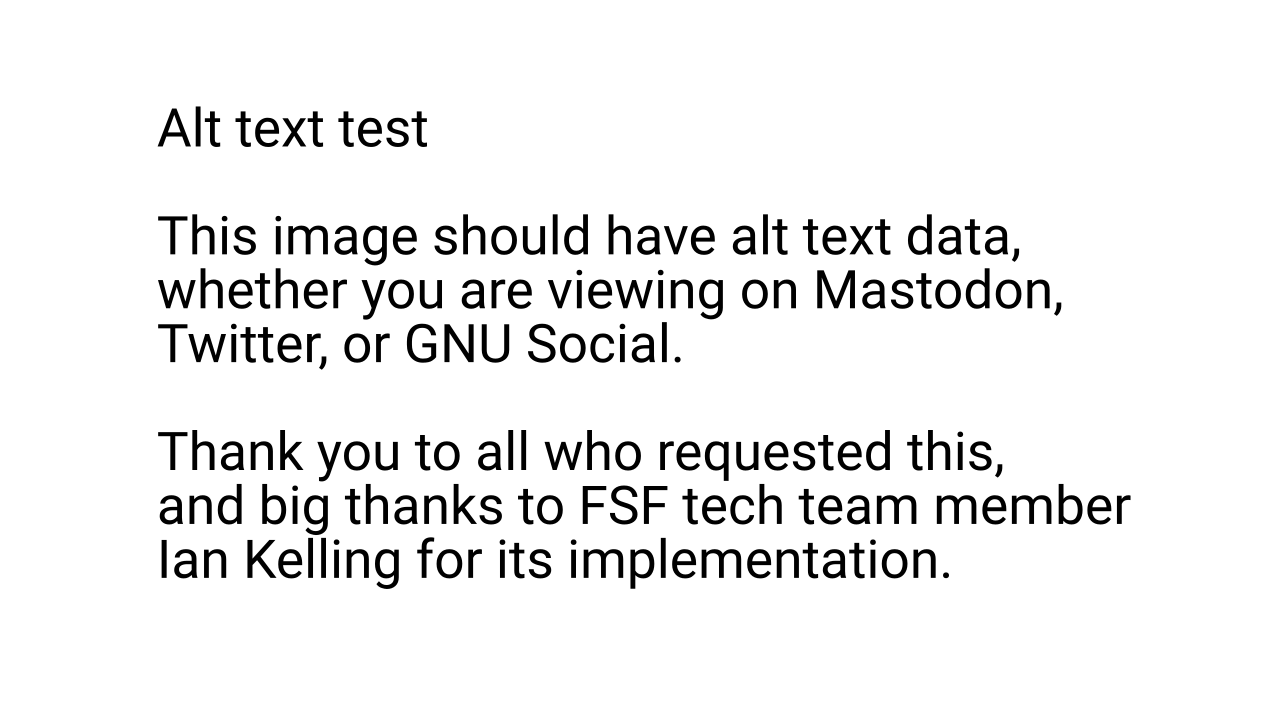 Alt text test -- This image should have alt text data, whether you are viewing on Mastodon, Twitter, or GNU Social. Thank you to all who requested this, and big thanks to FSF tech team member Ian for implementing. Read more about how we post: https://fsf.org/twitter