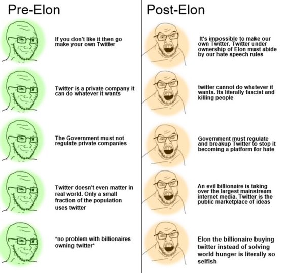 When right-wingers were getting kicked off twitter, it was “it’s a private company, they can do what they want. if you don’t like it, make your own”. Now the bluechecks are seething about this purchase, pointed out that there is no microblogging alternative with the reach of twitter, etc.