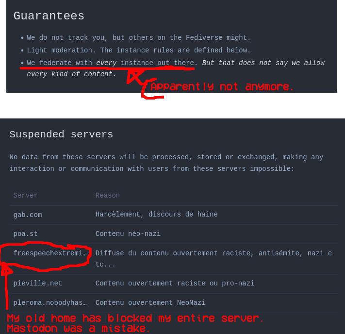 When maly.io returned under new management, they started blocking instances but kept "We federate with every instance out there." in /about/more. Of the five servers blocked, FSE is one. I disagree with instance-blocking: blog.freespeechextremist.com/b .