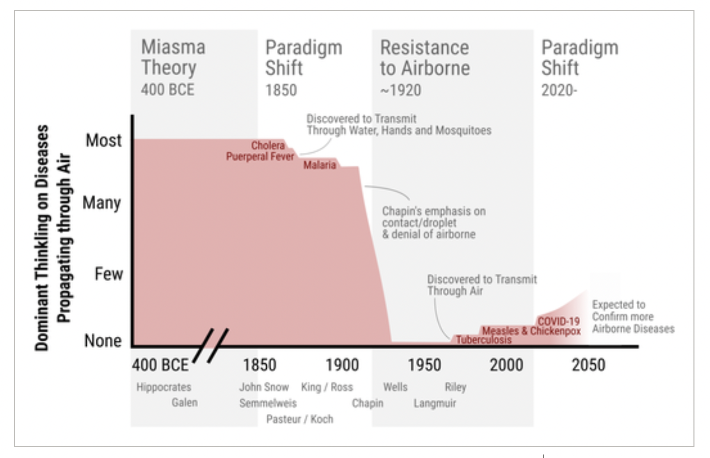Interesting summary paper on the history of airborne transmission of disease. Illustrates how rejecting a theory (the miasma theory of infection) that was sometimes right, but for the wrong reason, makes the replacement theory (infection only by contact or close proximity) much stickier than it deserved to be.