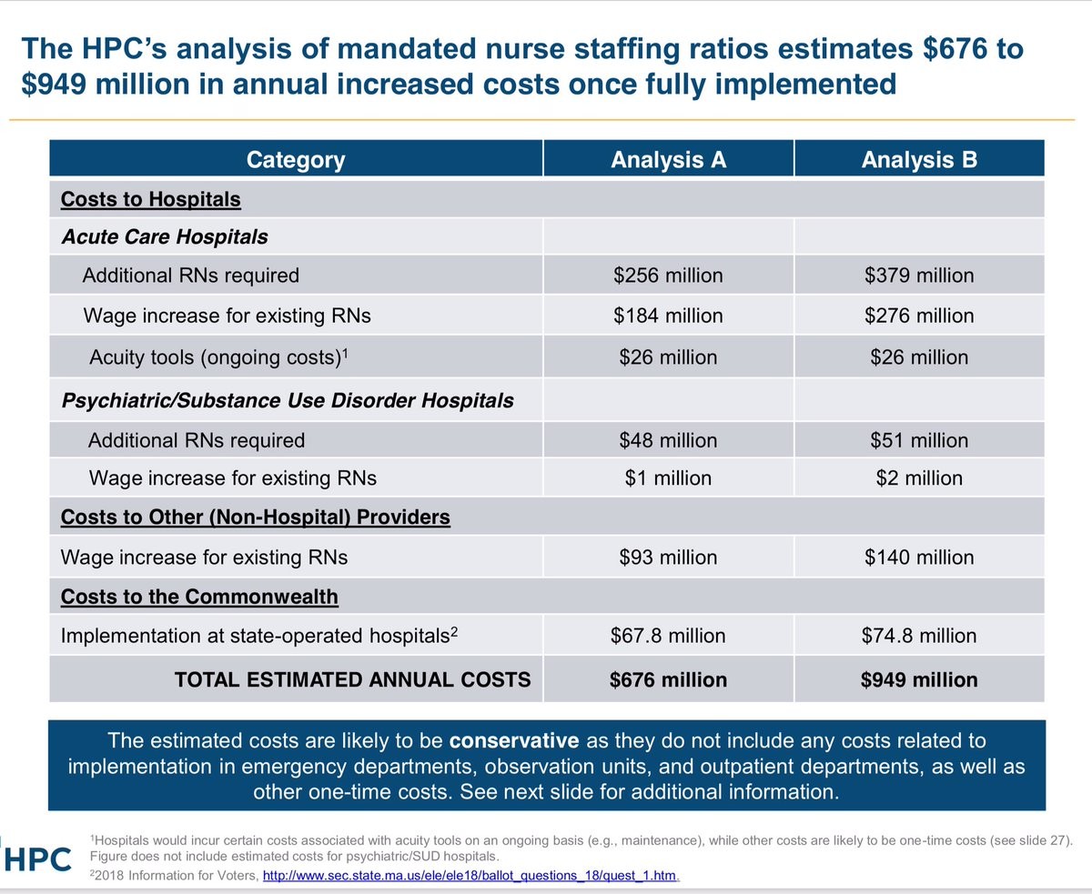 RT @karenreports@twitter.com: Just in: The Health Policy Commission’s analysis of mandated nurse staffing ratios estimates $676 million to $949 million in annual costs once fully implemented. Here’s a look at what the HPC researchers determined. #wcvb