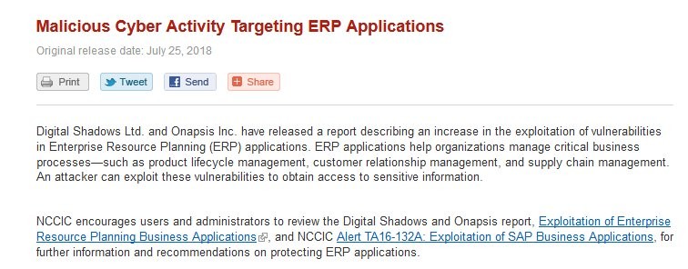 RT @campuscodi@twitter.com: In July 2018, the DHS, through US-CERT, also issued a similar warning of increased activity from nation-state hackers, criminal groups, and hacktivists against cloud-based Enterprise Resource Planning (ERP) systems.