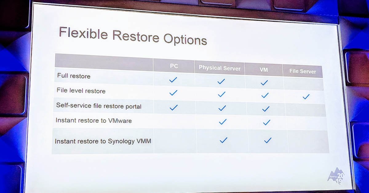 RT @ServeTheHome@twitter.com At and @Synology@twitter.com is showing off a great set of backup solutions scaling from a single user and single NAS to 1000's of sites and users with no additional license fees. Awesome.