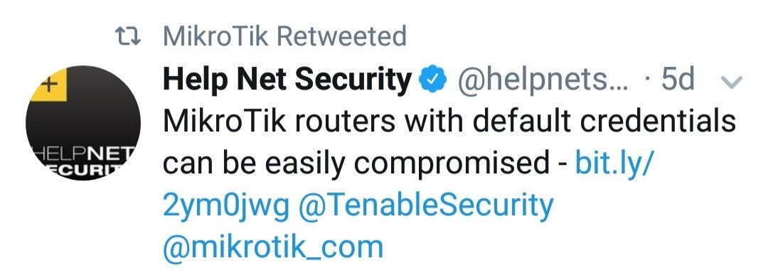 RT @ankit_anubhav@twitter.com Yes, it takes guts to retweet that your own devices can easily be compromised. @mikrotik_com@twitter.com has been responsive in quickly providing the patch, and trying to raise awareness rather than being ignorant like other vendors.