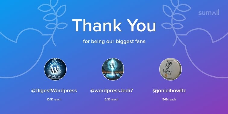 Our biggest fans this week: @DigestWordpress@twitter.com, @wordpressJedi7@twitter.com, @jonleibowitz@twitter.com. Thank you! via https://sumall.com/thankyou?utm_source=twitter&utm_medium=publishing&utm_campaign=thank_you_tweet&utm_content=text_and_media&utm_term=b32b39c300bfc0934a70243a