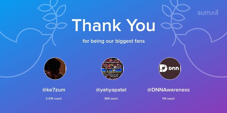 Our biggest fans this week: @ke7zum@twitter.com, @yahyapatel@twitter.com, @DNNAwareness@twitter.com. Thank you! via https://sumall.com/thankyou?utm_source=twitter&utm_medium=publishing&utm_campaign=thank_you_tweet&utm_content=text_and_media&utm_term=b32b39c300bfc0934a70243a
