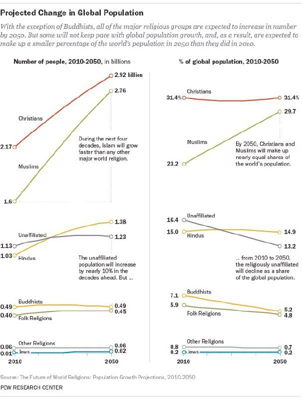 * количество мусульман и христиан почти сравнится (под 3 млрд человек)