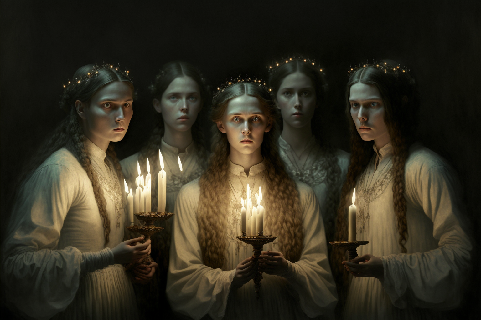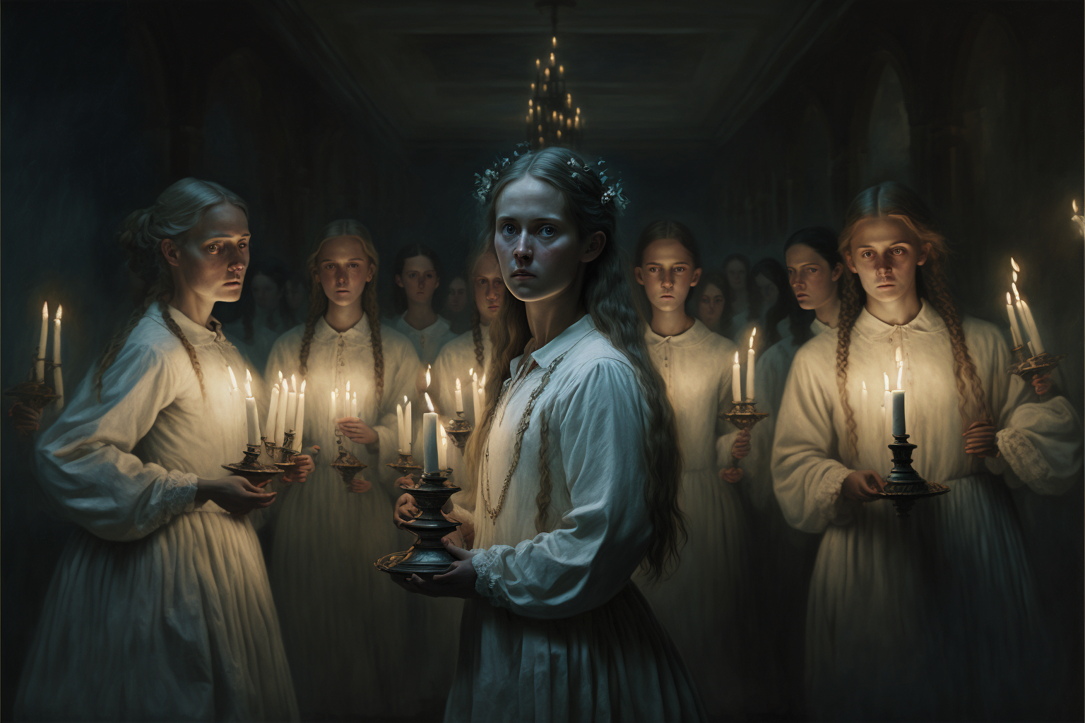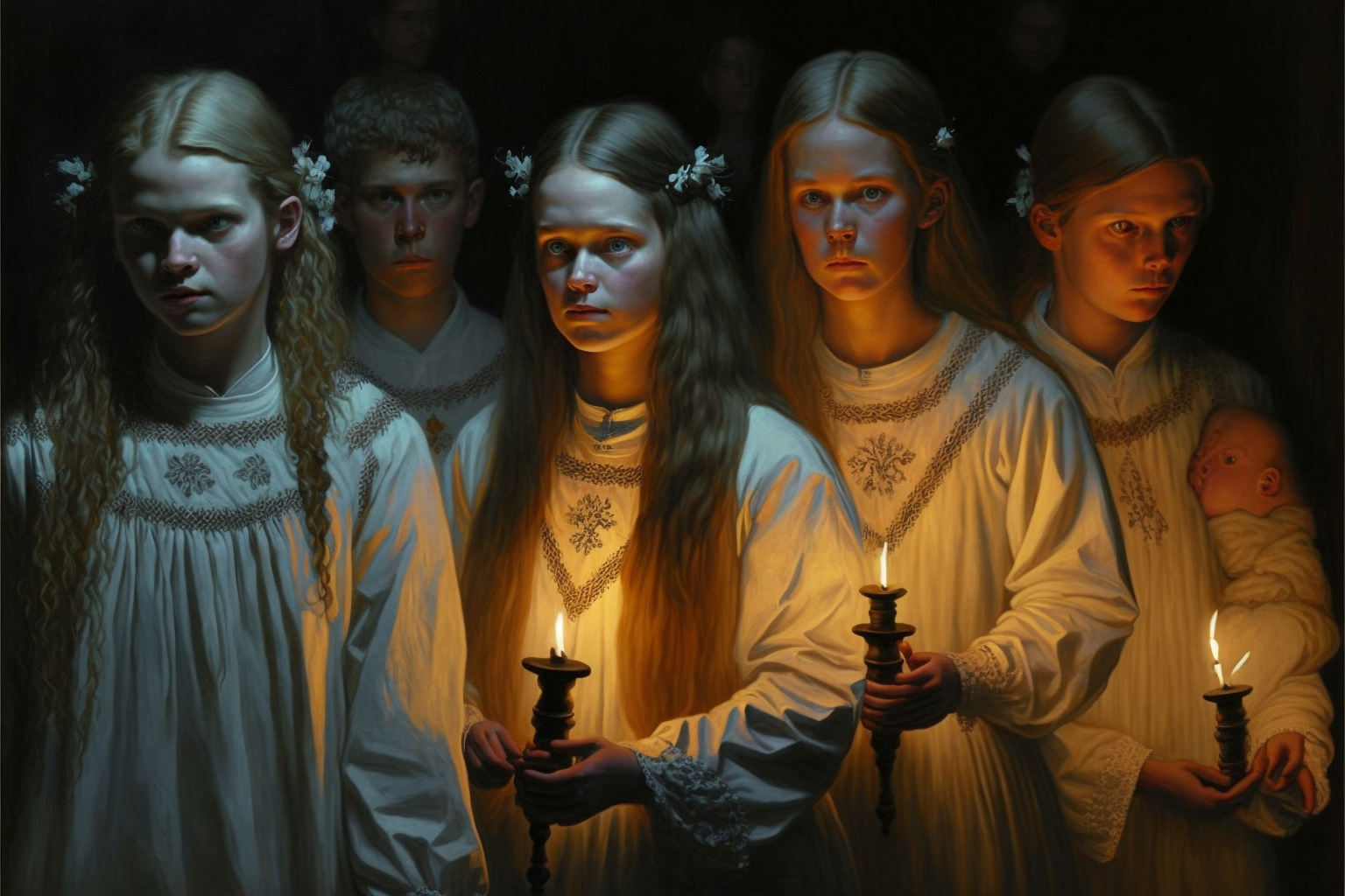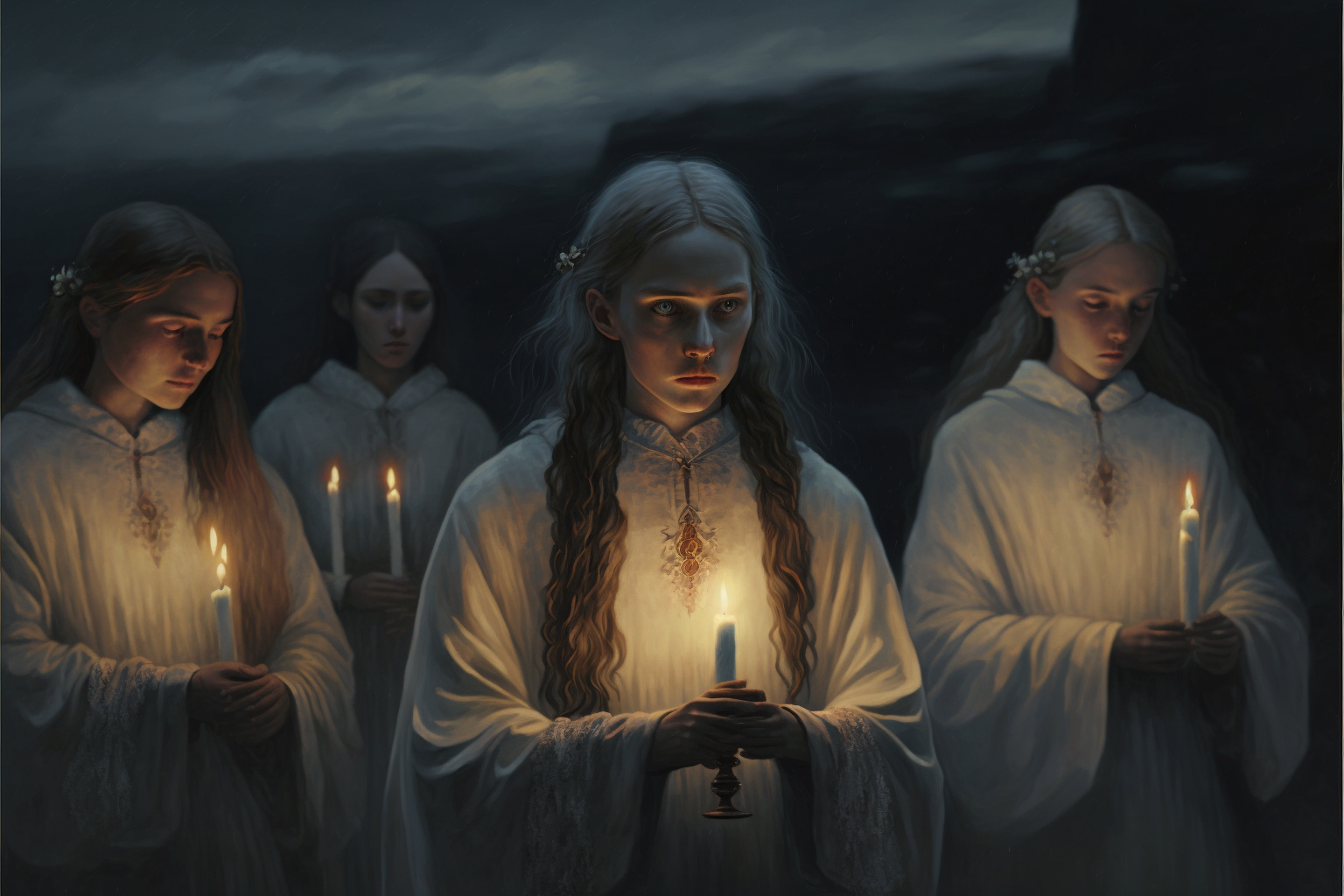 Prompt: 'a group of people holding candles in their hands, by Daniel Ljunggren, wearing a white folkdrakt dress, an ancient, vril, lada' (from CLIP)