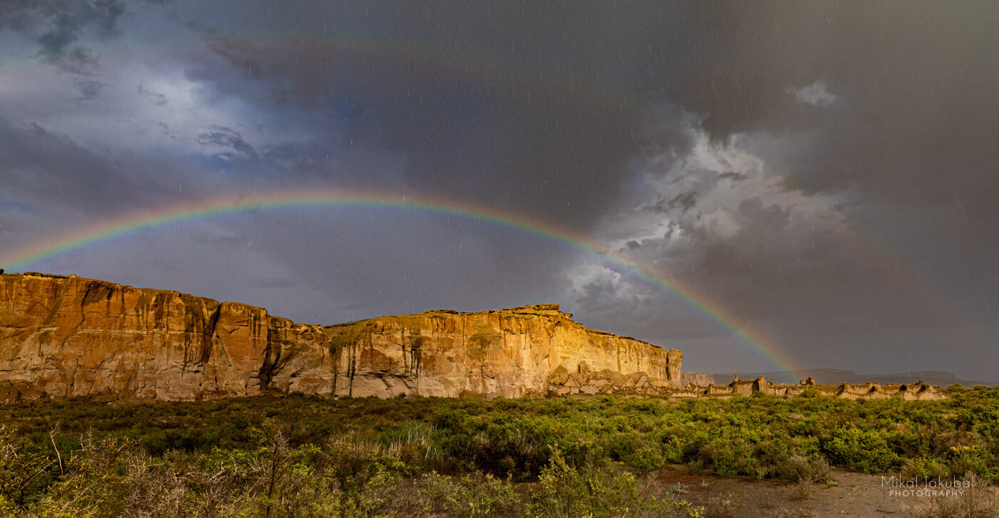 Chaco Canyon from my storm chase trip there last fall. Hard to tell on anything but a big screen, but the rainbow is landing in Pueblo Bonito, the biggest of the ruins. Similarly, the sky is full of raindrop streaks, since it was pouring on me when I shot this from under and umbrella.