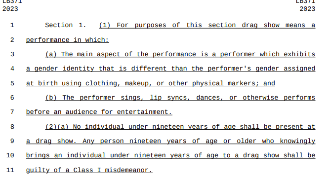 They are no longer making pretense of targeting the drag community alone. Now they are explicitly targeting transgender people. Nebraska has recently done the same thing in dropping the pretense, although they don't explicitly spell out transgender people, just gender identity.