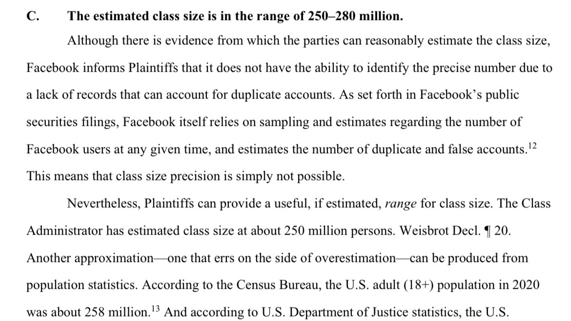But important to note the class is now basically every single adult in America. Basically for $2-3 each, Facebook got to expose our personal data to thousands of apps, build what was a trillion dollar platform, and importantly enrich and avoid liability for its leadership. 2/5