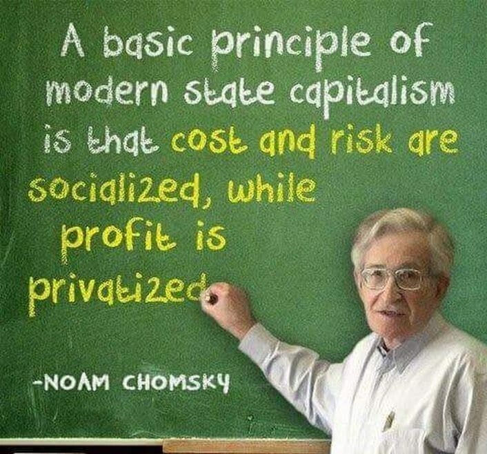 @LeftistLawyer Meme quoting Noam Chomsky: A basic principle of modern state capitalism is that cost and risk are socialized, while profit is privatized. [and subsidized, I might add.]