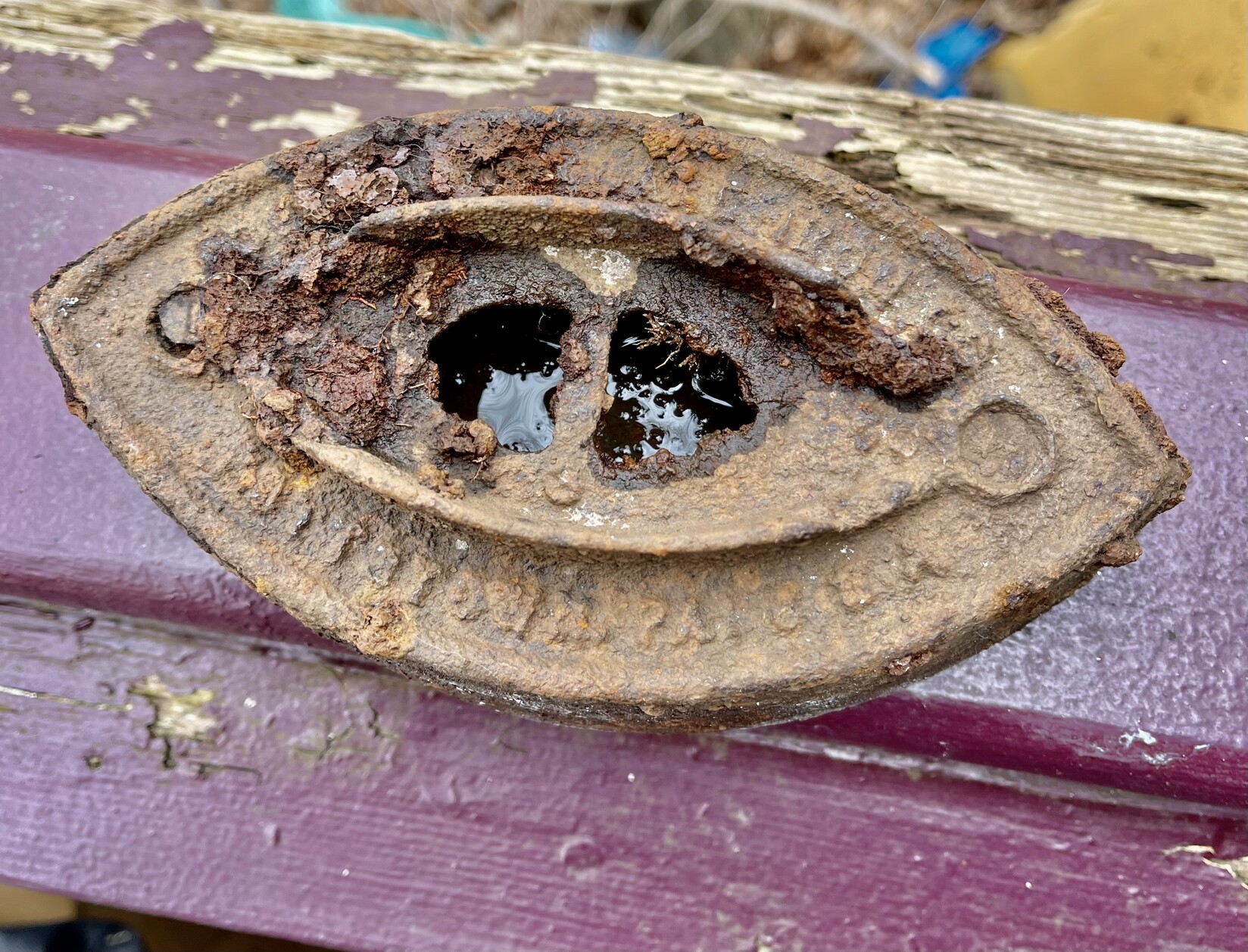 I found this thing buried in the woods behind my house! I THINK it might be a clothing iron without a handle? It’s VERY heavy though hollow.