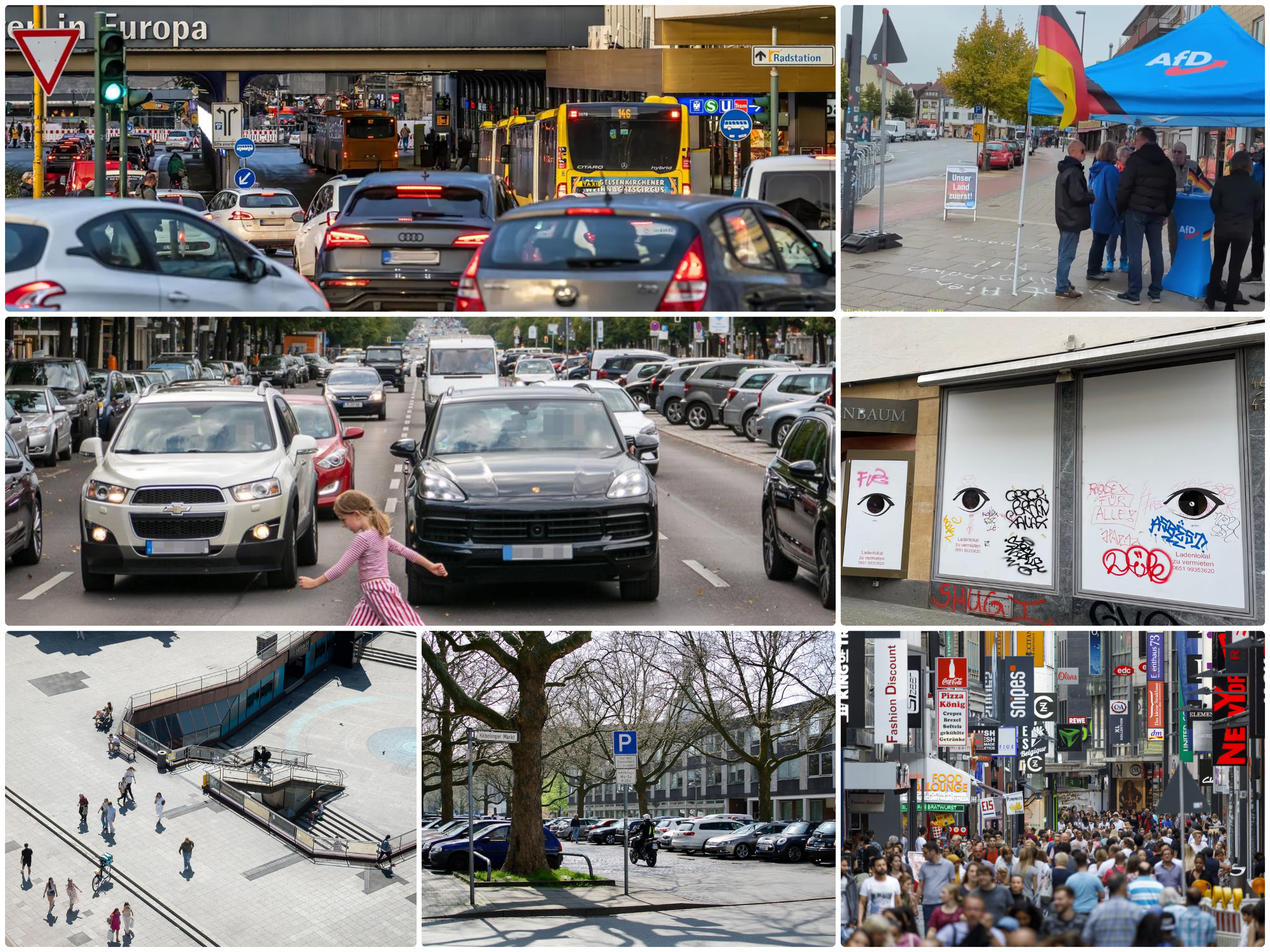 Nazis, die Passanten belästigen, Dauerstaus und lärmende Autos, marginalisierter Fußverkehr, unerträglich heiße und versiegelte Betonwüsten, Parkplätze statt Parks und Plätzen, Leerstand und die immergleichen Ladenketten.
