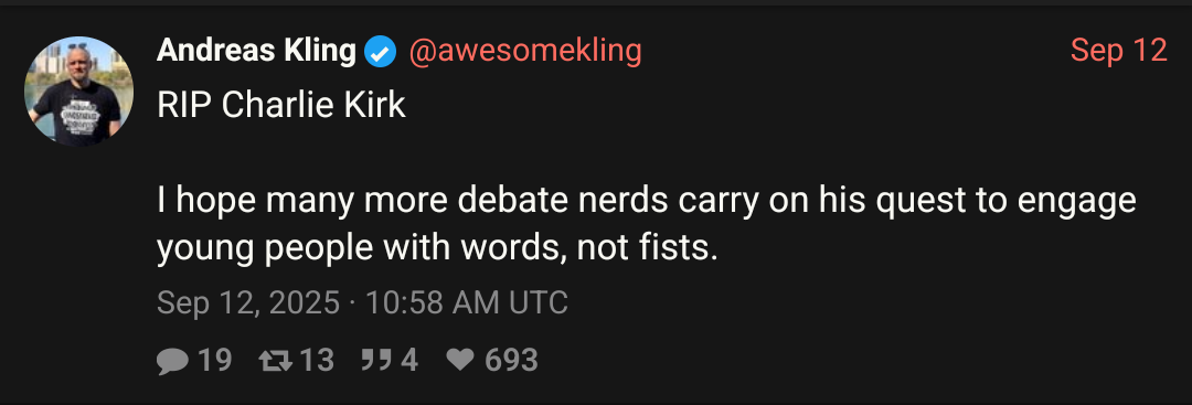 To summarize (apparently the link already got cached over here), the post contains a screenshot of Kling talking about excluding Nazis from projects as a "hateful rot within the industry", specifically in the context of people's reactions to Kirk's death.