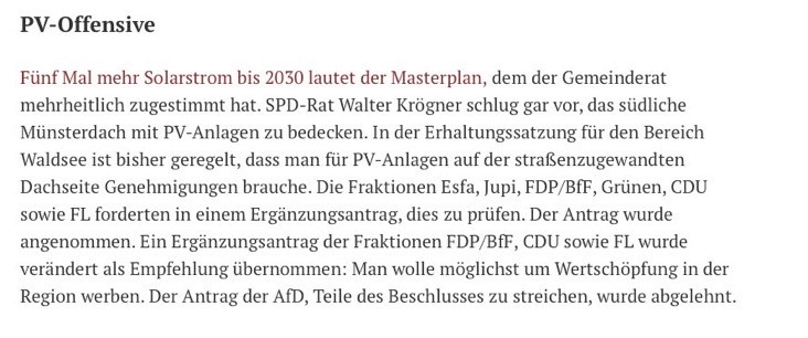 Es freut uns, das unser Vorschlag (https://balkon.solar/news/2023/11/24/masterplan-solar-in-freiburg-wir-haben-da-mal-ein-paar-vorschlaege/) #Solar Hürden in #Freiburg’er Gestaltungssatzungen zu beseitige, Teil des “Masterpla #Solar” werden soll (https://www.badische-zeitung.de/gemeinderat-beschliesst-ueber-kurzzeitparken-am-opfinger-see-und-muellgebuehren)