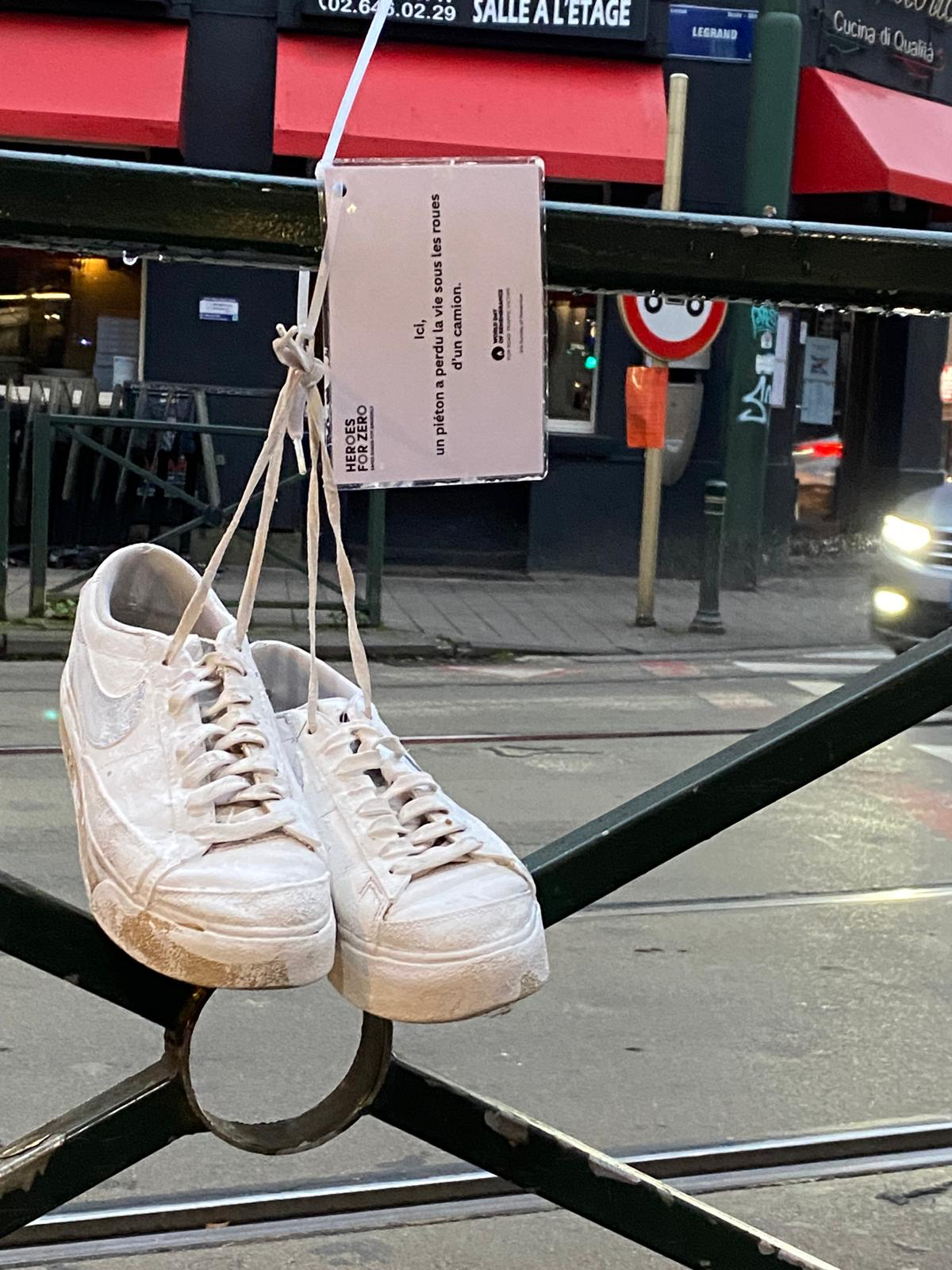 Thanks 🙏 #HeroesForZero for drawing attention to deaths of pedestrians in #Brussels this year: this “ghost shoe” indicates the location of a recent fatale accident at Bascule 🚛