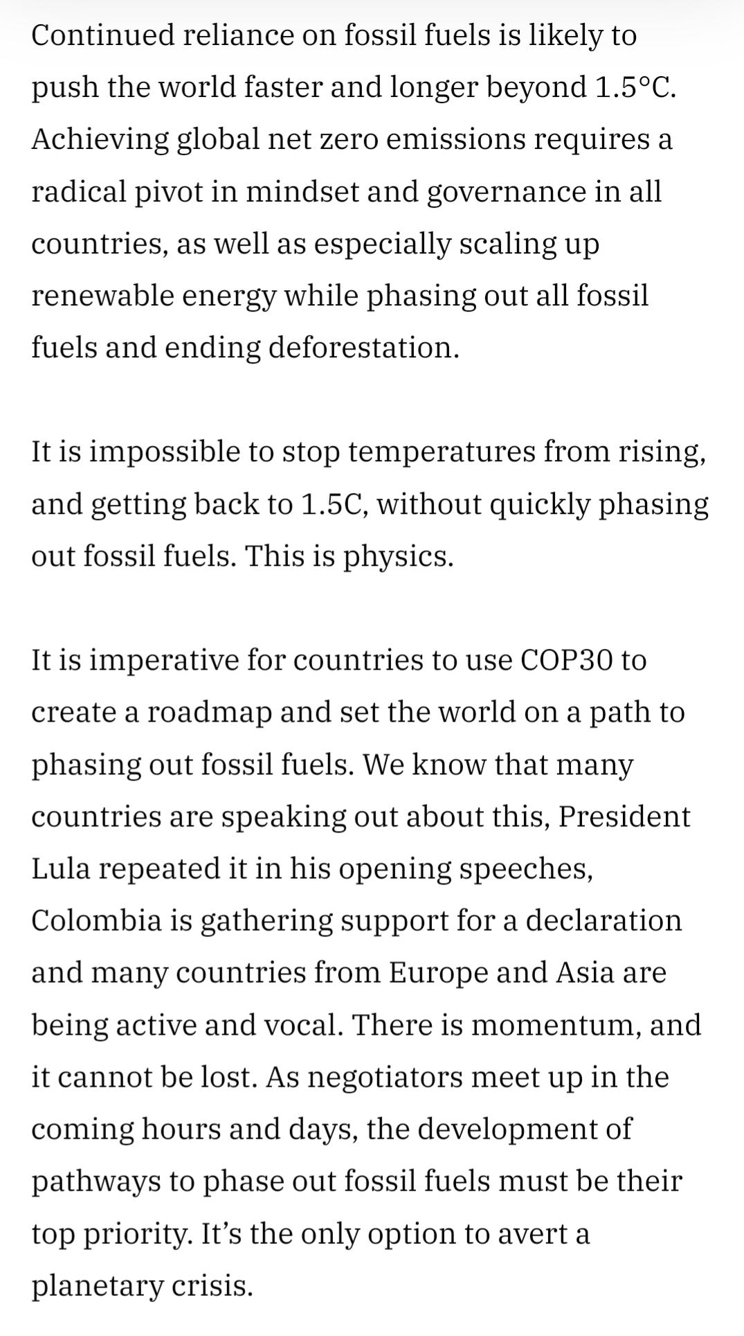 "It is impossible to stop temperatures from rising, and getting back to 1.5C, without quickly phasing out fossil fuels. This is physics."