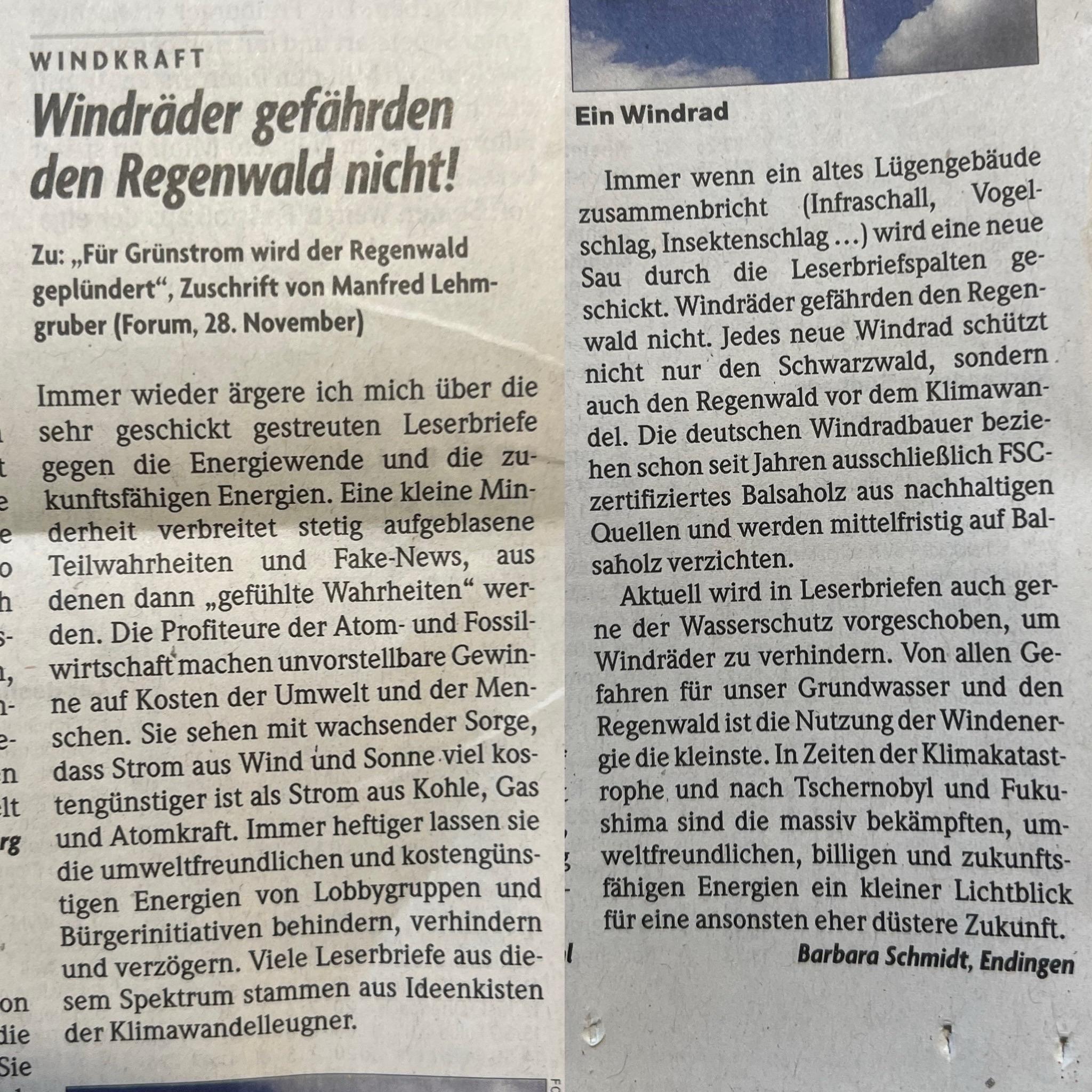 Wahrlich ein Leserbrief der das Vorgehen der #Windkraftgegner gut beschreibt: Sobald ein Thema argumentativ abgeräumt ist, wird eine neue vermeintliche Umweltgefahr diskutiert.