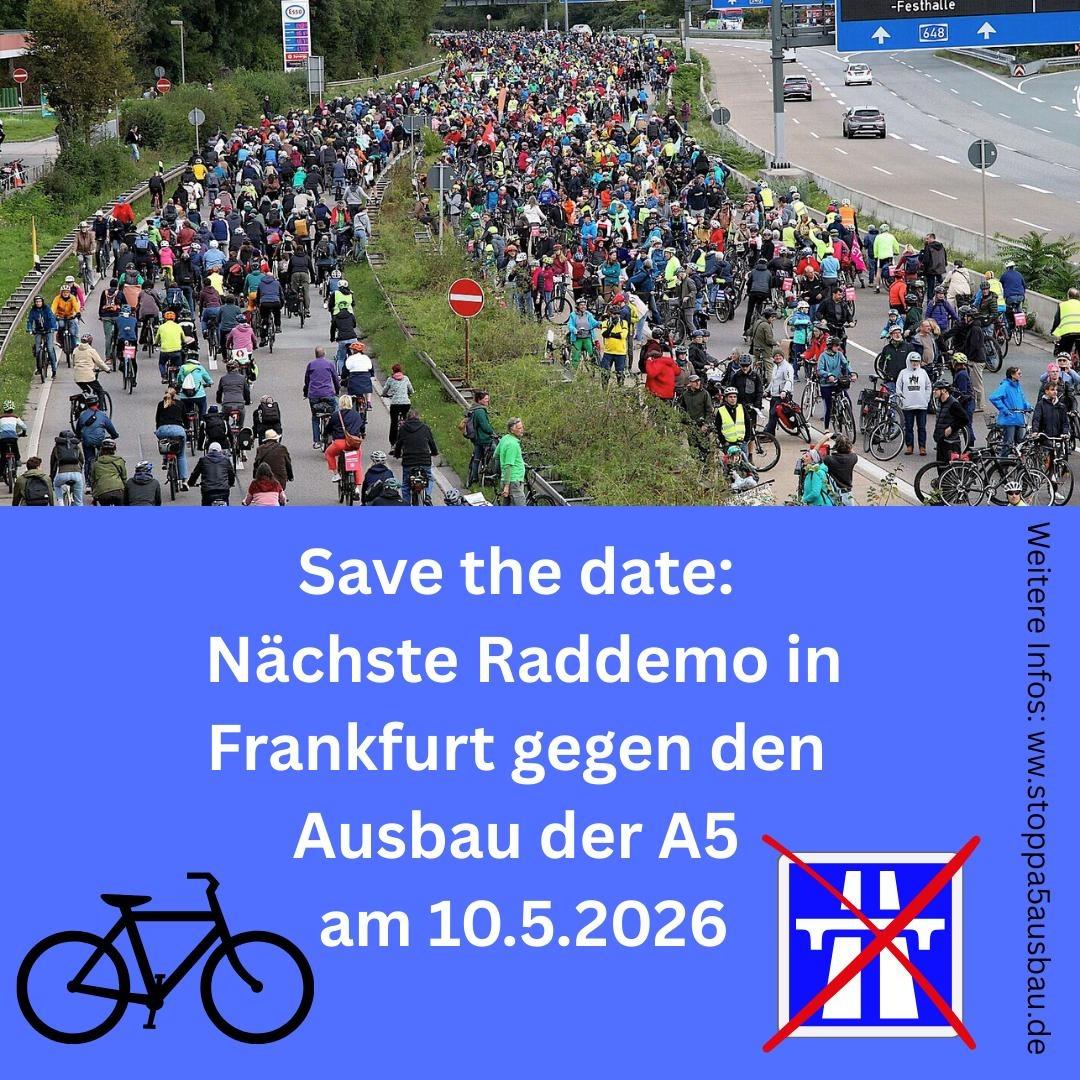 Es geht weiter: dieses Jahr ist wieder eine Raddemo dran, um den Ausbau der Autobahn A5 zu einem wahren Monster mit 10-15 Fahrspuren zu verhindern - und das in Zeiten der Klimakatastrophe.