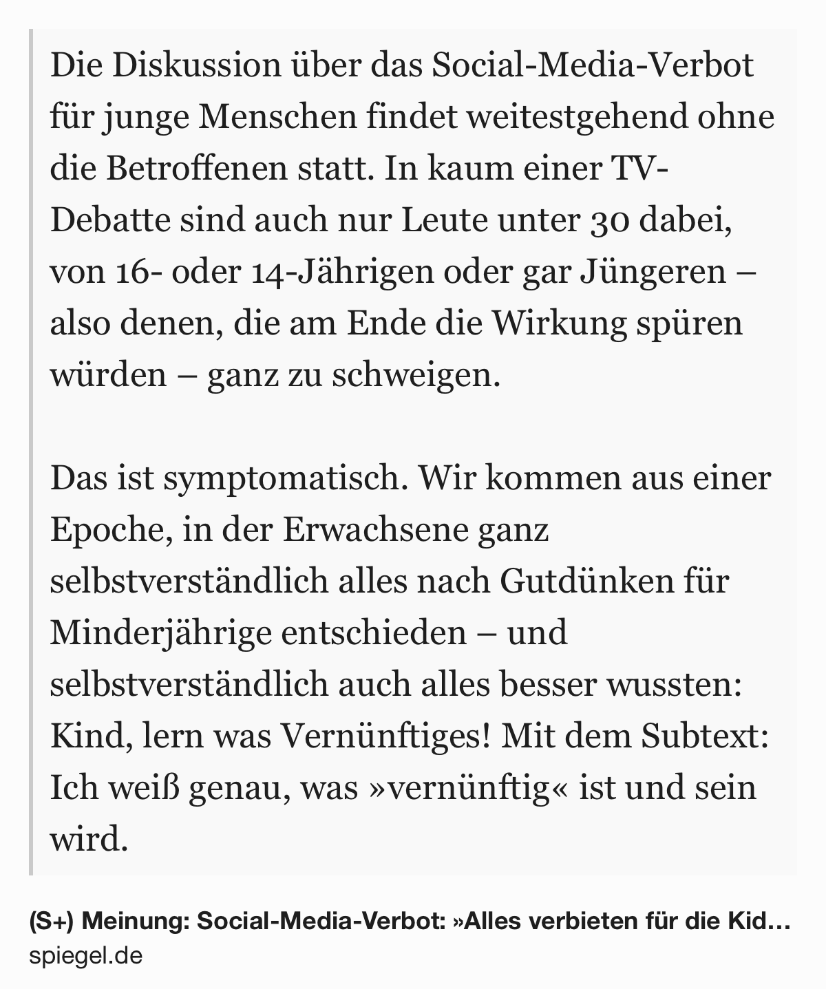 Social-Media-Verbot: »Alles verbieten für die Kids, sofort!« https://www.spiegel.de/netzwelt/netzpolitik/social-media-verbot-alles-verbieten-fuer-die-kids-sofort-kolumne-a-8f2ae3c3-068b-415b-8920-8971e5ace4f8