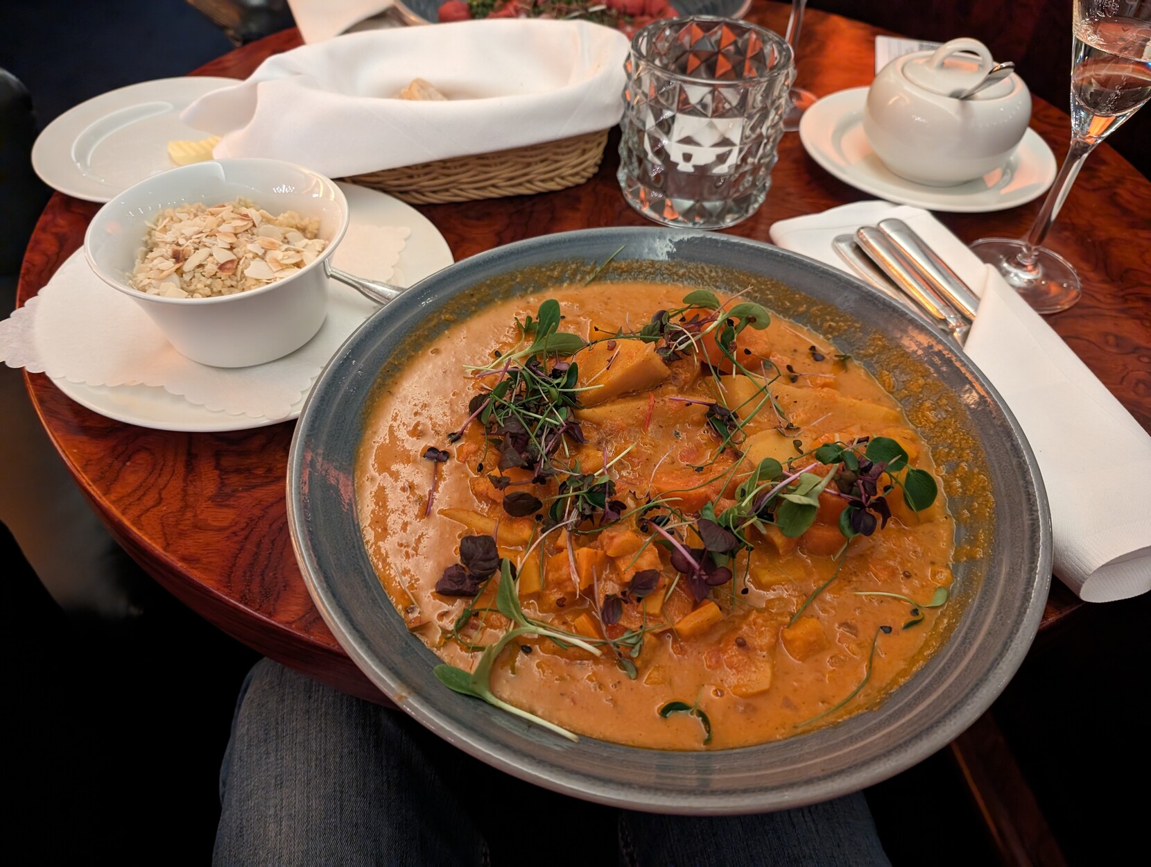 Kürbis-Karotten-Curry mit Zimt-Bulgur und Mandeln. Und das im Restaurant im Parkhotel Pforzheim. Die können kochen. Sehr, sehr lecker!
