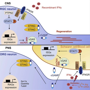 "Here, we found that protein tyrosine phosphatase non-receptor type 2 (Ptpn2) inhibition combined with low-dose IFNγ enhances CNS axon regeneration by amplifying IFNγ-STAT1 signaling, with the cGAS-STING pathway as the functional downstream signaling. In the PNS, the IFNγ-cGAS-STING axis is coordinated by both neuronal and non-neuronal cells to support spontaneous axon regeneration."