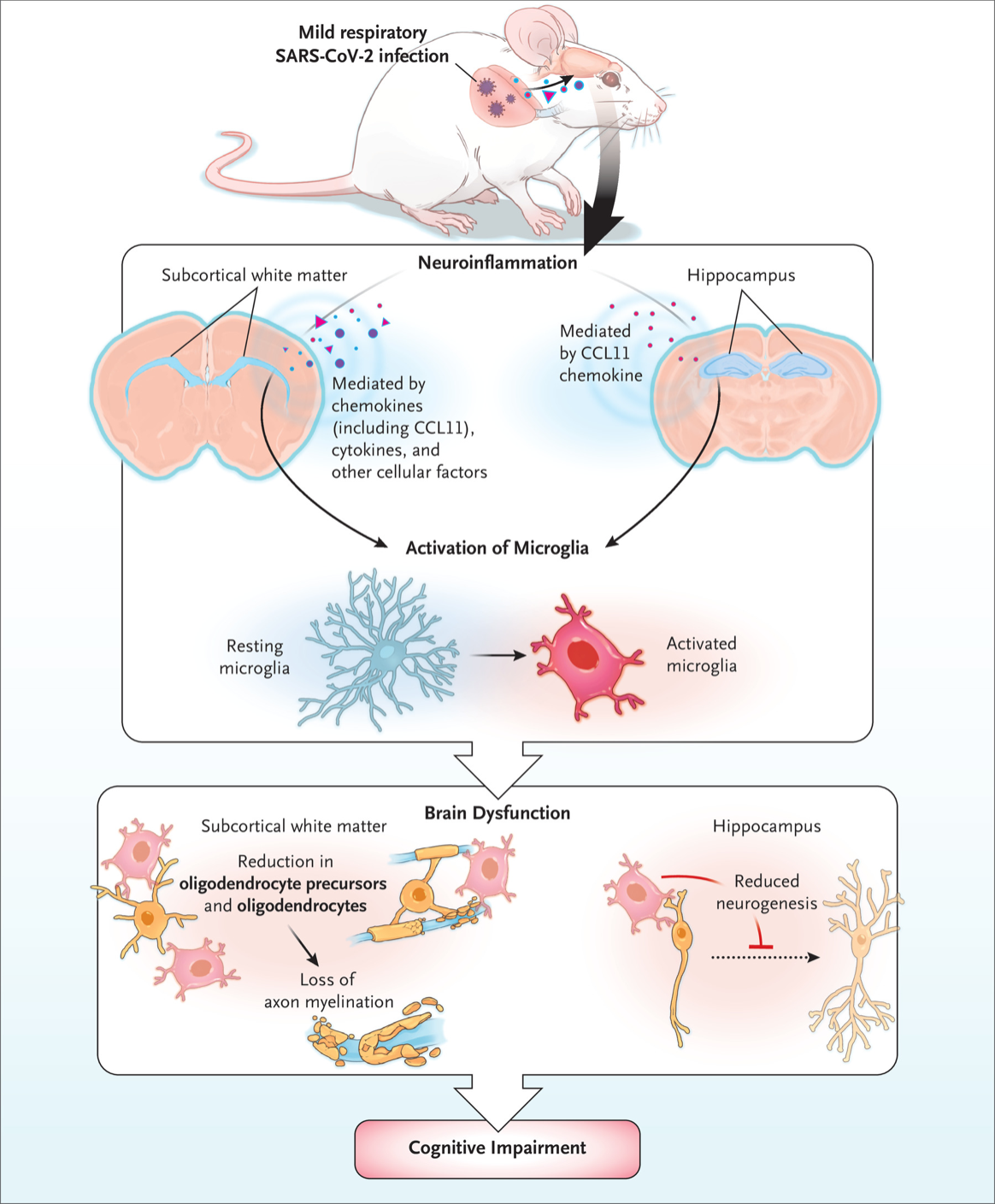 "In the hippocampus, the activation of microglia was associated with inhibited neurogenesis, which could explain impaired memory formation in patients. The activation of microglia appeared to be mediated by persistently elevated levels of a molecule called C-C motif chemokine 11 (CCL11). CCL11 has been associated with aging and with inhibition of neurogenesis."