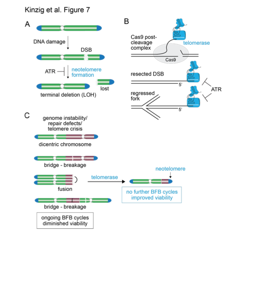 "Here, we aimed to determine whether telomerase can add telomeric DNA to DSBs in human cells and how this process is regulated. The data indicate that telomerase can create a functional neotelomere at a Cas9-induced DSB that bears the TS sequence at one 3′ end. The frequency of neotelomere formation is increased upon overexpression of telomerase, suggesting that the low level of telomerase in most human cells minimizes these deleterious events. In addition, neotelomere formation is inhibited by ATR signaling at resected DSBs. We discuss these findings in the context of genome instability during tumorigenesis, where neotelomere formation by telomerase might end BFB cycles as originally proposed by McClintock."