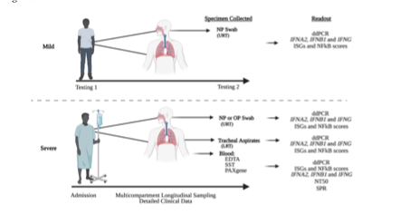 "We designed a study to characterize the expression of interferon alpha-2 (IFNA2) and interferon beta-1 (IFNB1), both type-1 interferons (IFN-1), interferongamma (IFNG), a type-2 interferon (IFN-2), ISGs, and NF-κB response genes in the upper respiratory tract (URT) of patients with mild (outpatient) versus severe (hospitalized) COVID-19. Further, we characterized the weekly dynamics of these responses in the upper and lower respiratory tracts (LRTs) and blood of severe patients to evaluate for compartmental differences."