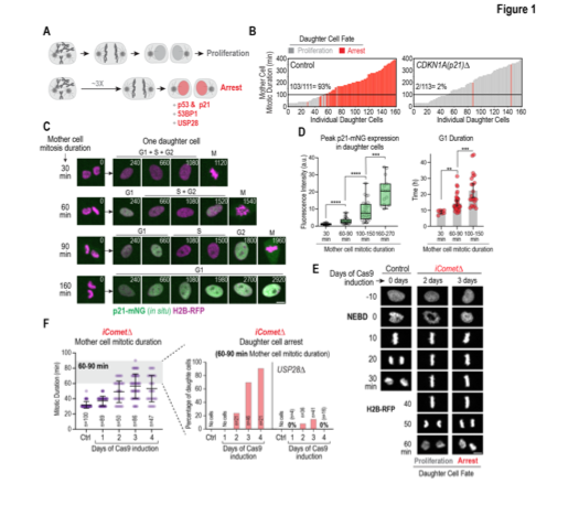 "We show that memories of mitotic duration are integrated by a p53-based mitotic stopwatch pathway to exert tight control over proliferation. The stopwatch halts proliferation of the products of a single significantly extended mitosis or of successive modestly extended mitoses. Time in mitosis is monitored via mitotic kinase-regulated assembly of stopwatch complexes that are transmitted to daughter cells."