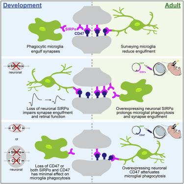 "Here, we show that neuronal signal-regulatory protein alpha (SIRPα) is a permissive cue for microglial #phagocytosis in the developing murine retina. Removal of neuronal, but not microglial, SIRPα reduced microglial phagocytosis, increased synpase numbers, and impaired circuit function. Conversely, prolonging neuronal SIRPα expression extended developmental microglial phagocytosis. These outcomes depended on the interaction of presynaptic SIRPα with postsynaptic CD47."