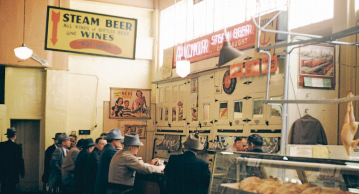 'As the 1950s wound down, the proliferation of mass-produced, heavily marketed light lagers took an increasing toll on America’s—and San Francisco’s—small brewers. But a number of local establishments still proudly featured Anchor’s signature product, in particular the Crystal Palace Market between Market and Mission at 8th Street. According to the San Francisco Chronicle, it was a “sprawling, pungent, cheap and exotic carnival of delicatessen and delicacy.”
