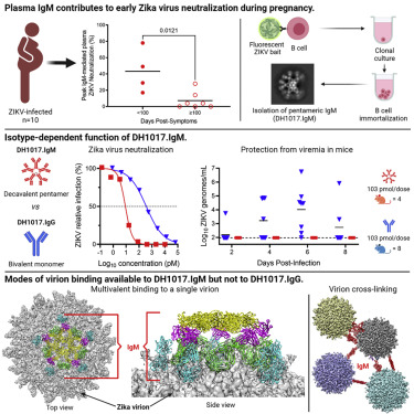 "We probed the B cell repertoire from peripheral blood of mothers with primary and secondary ZIKV infections and established 9 ZIKV-binding B lymphoblastoid cell lines (B-LCL). One of them produced an IgM antibody, DH1017.IgM, in its native pentameric conformation. DH1017.IgM was somatically mutated, did not cross-react with other flaviviruses, displayed ultrapotent ZIKV neutralization that depended on its isotype and protected mice from viremia more efficiently than the respective IgG upon lethal ZIKV challenge."