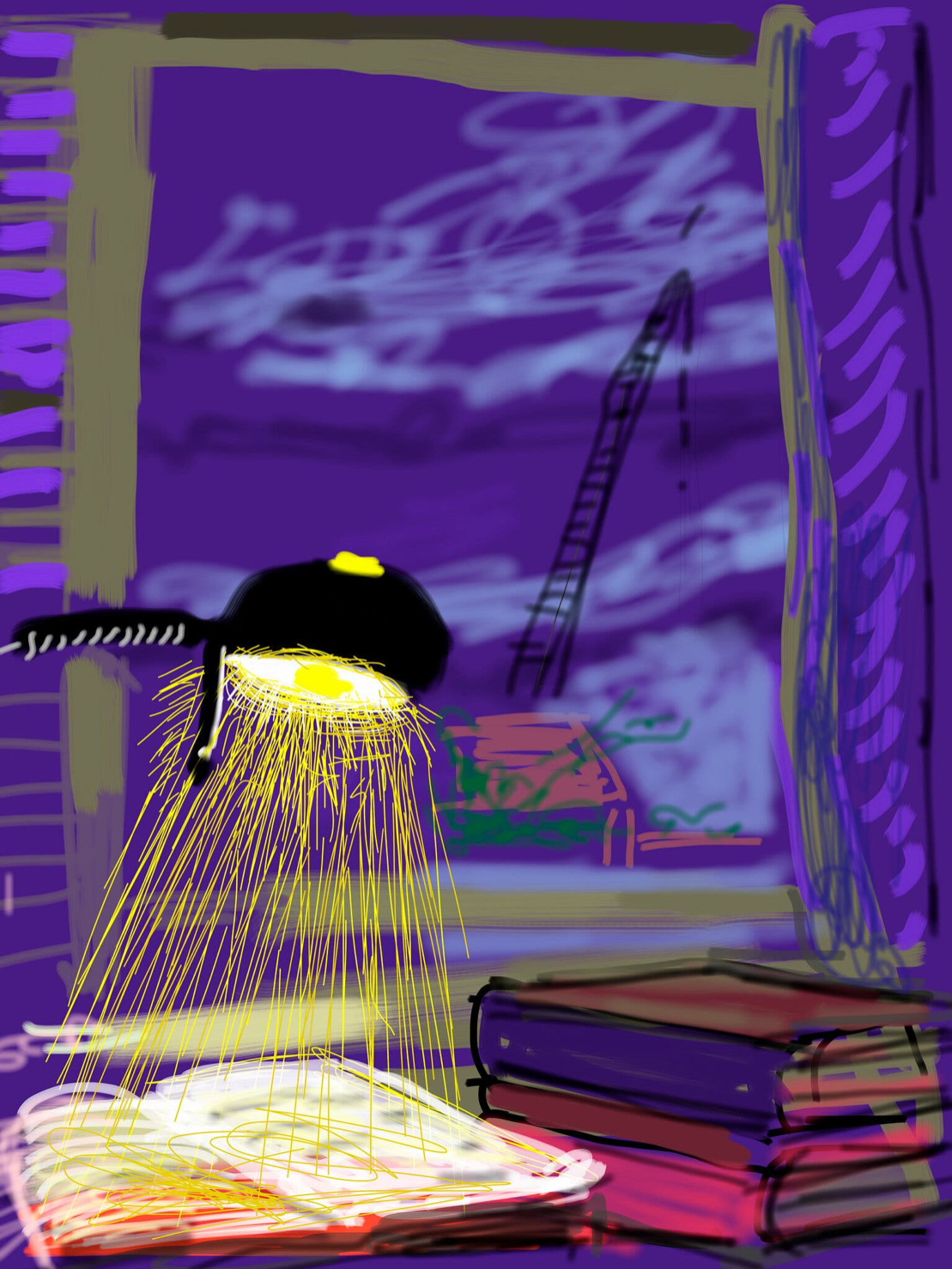"In 2009 Hockney began “drawing” this view on his iPhone (above), with just his thumb. “There was great advantage in this medium because it’s backlit and I could draw in the dark,” he writes in MY WINDOW (Taschen, $150), a collection of 120 digital still lifes he completed between 2009 and 2011. Plus, he never had to leave his bed."