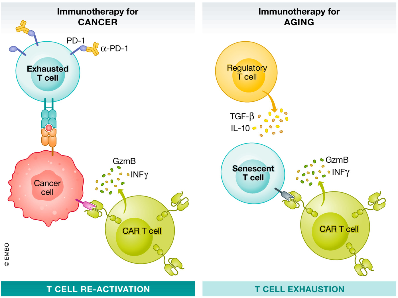 'During the last decade, the stimulation of T-cell function by the blockage of immunosuppressive checkpoints has experienced an outstanding impact in the treatment of cancer. Development of the chimeric antigen receptor T-cell technology has also emerged as a powerful alternative for patients suffering from oncological processes, especially those affected by hematological neoplasms. Recent evidence suggest that the use of immunotherapy could be extended to non-oncological diseases and could be especially relevant for age-associated disorders, opening exciting therapeutic options for a wide range of diseases of the elderly.'