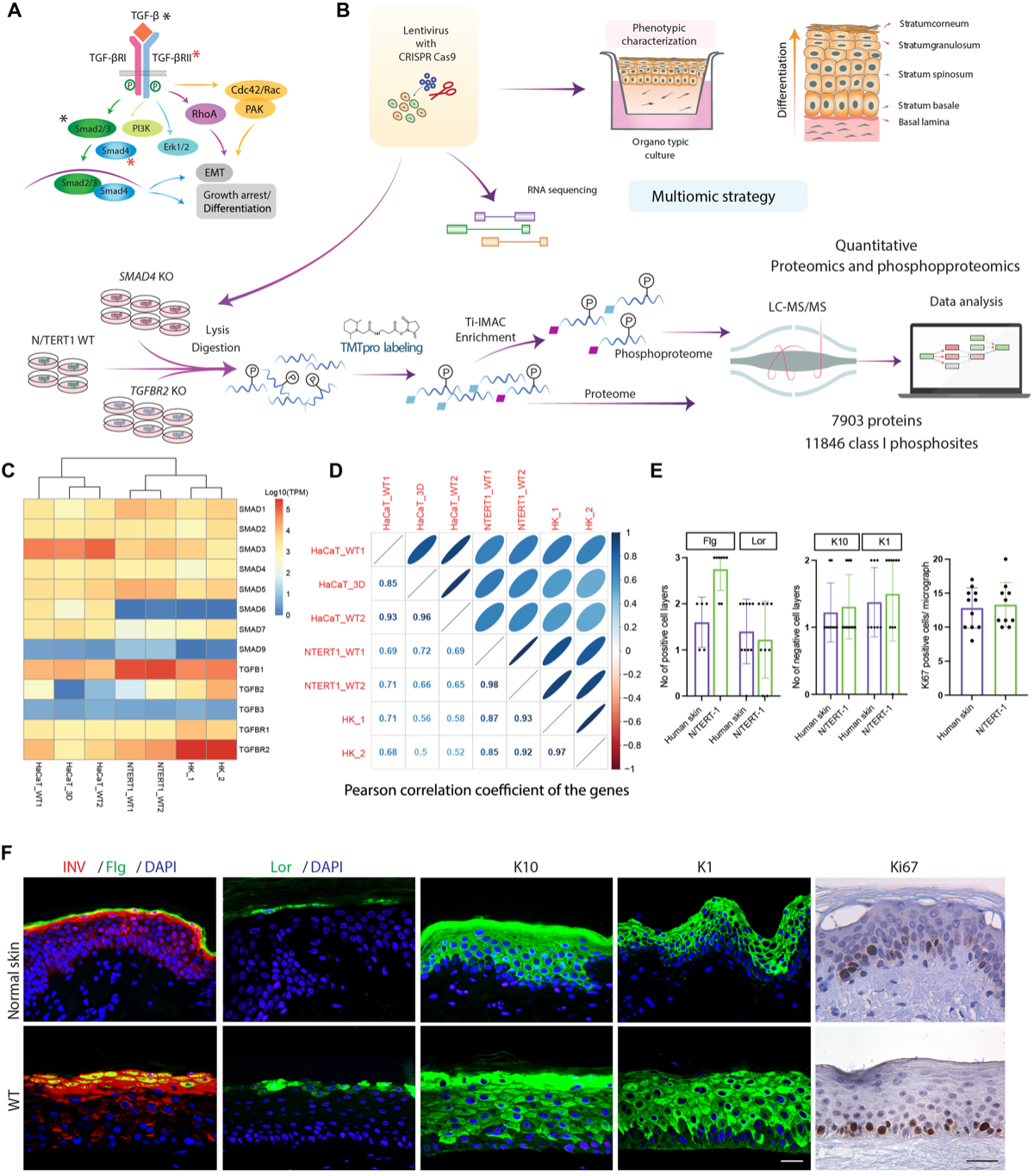 "Although many of the fundamental observations in murine models are expected to be similar in human tissue, it may still be difficult to directly transfer the observations to a human context. In particular, murine skin architecture is dominated by hair follicles, which are less frequent in human skin, leaving human skin with a larger proportion of much thicker interfollicular epidermis (22). Hence, to understand and translate the functions of the TGF-β signaling pathways into a human setting, it is important to use a human cellular and tissue system"